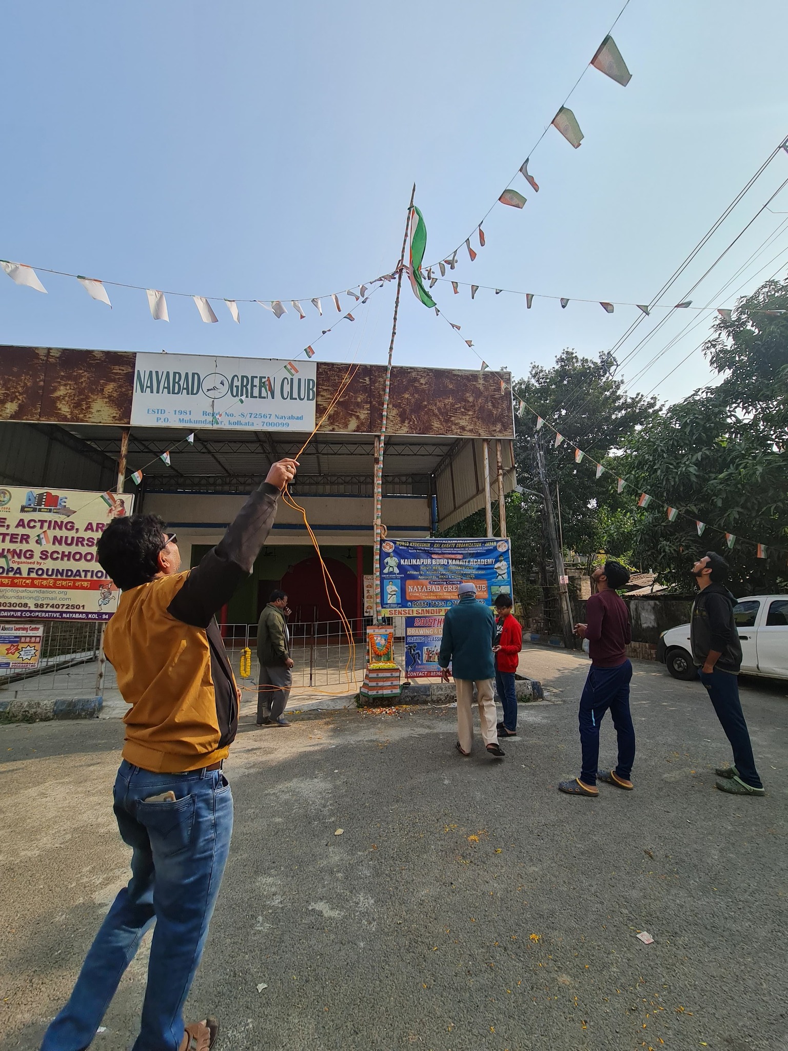 This image shows people gathered at Nayabad Green Club, participating in a flag hoisting ceremony. The scene reflects unity, patriotism, and the spirit of togetherness in the neighborhood.